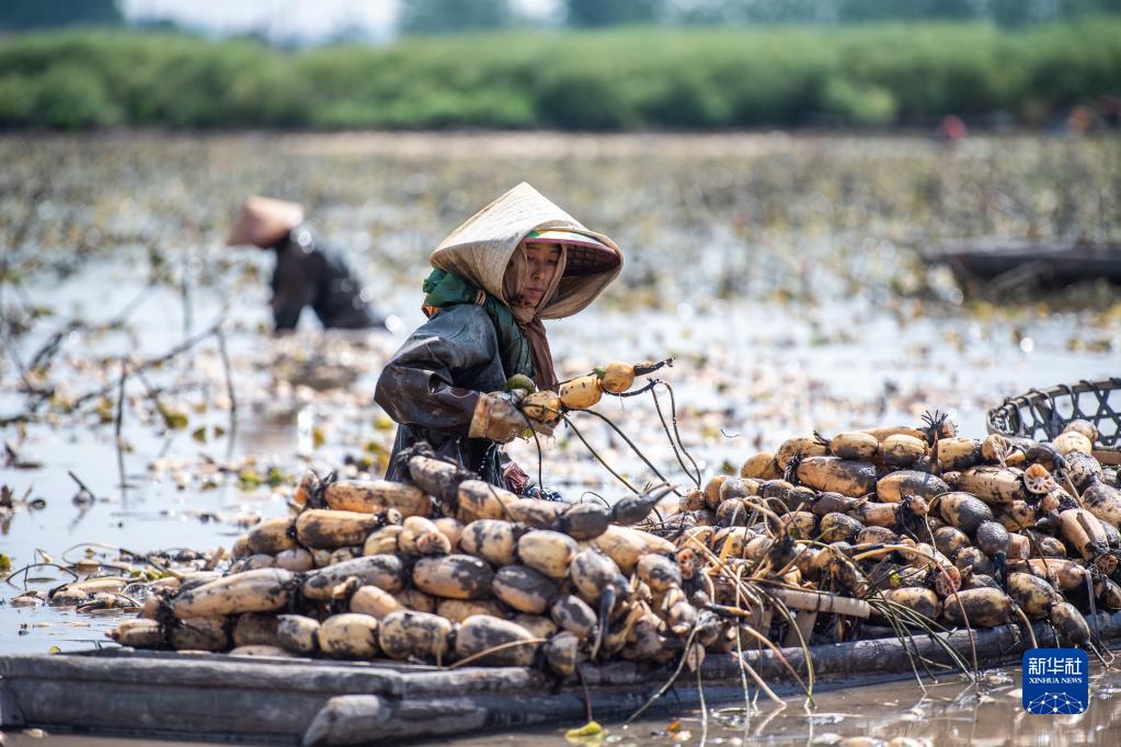 4月26日,藕農在湖南省益陽市南縣中魚口鎮菱角湖村的荷塘中采挖蓮藕。