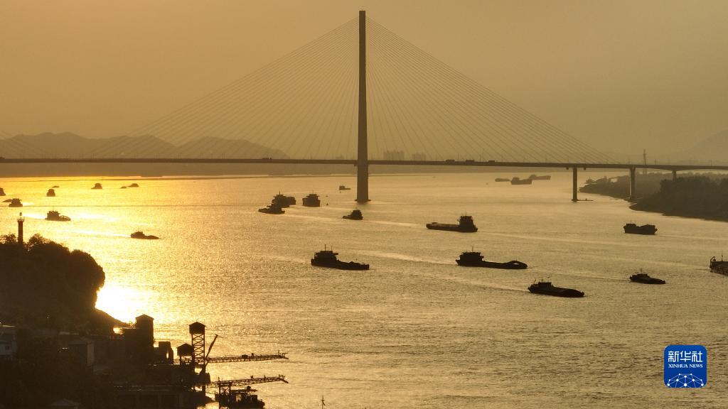4月26日傍晚,在長江江西九江瑞昌段的航道上,往來船只與夕陽組成了一幅壯美畫面(無人機照片)。