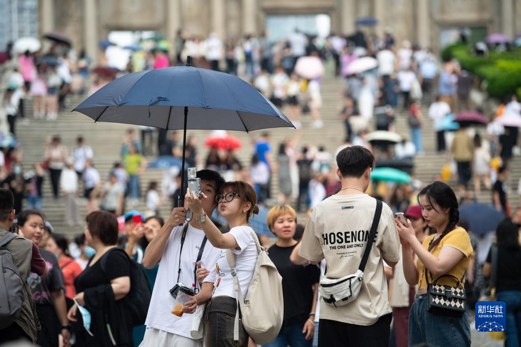 4月29日,游客在澳門大三巴牌坊前地游覽。