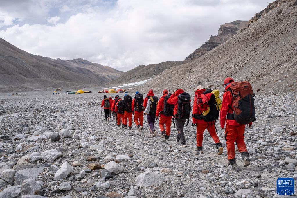 “巔峰使命”珠峰科考隊員在完成登頂科考任務(wù)后,返回海拔5200米的珠峰大本營(2022年5月5日攝)。