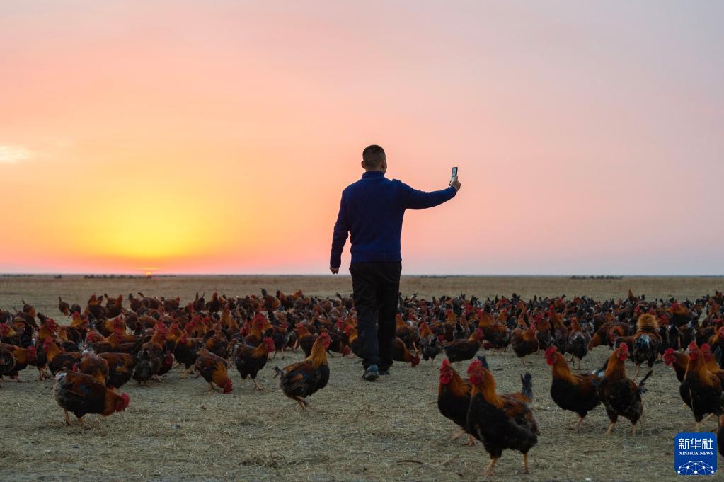 在黑龍江省明水縣的草原上,返鄉創業、帶領當地村民增收的軍蕊溜達雞產品有限公司負責人桑慶軍在進行網絡直播(2019年10月30日攝)。