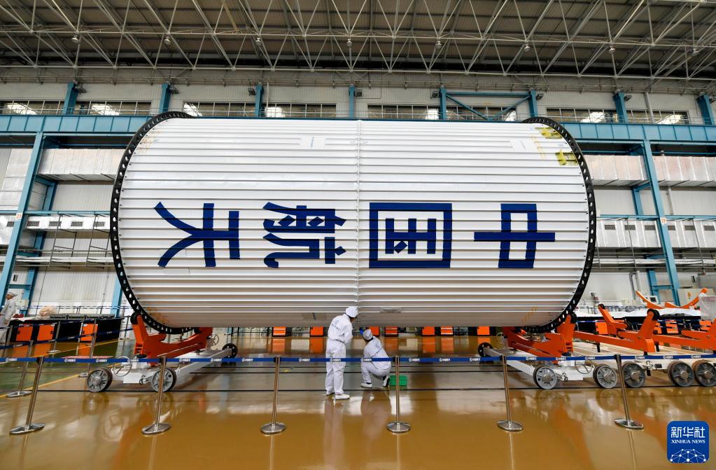 在航天科技集團一院天津火箭公司總裝測試車間,裝配一組班組成員在進行火箭裝配(2023年4月19日攝)。