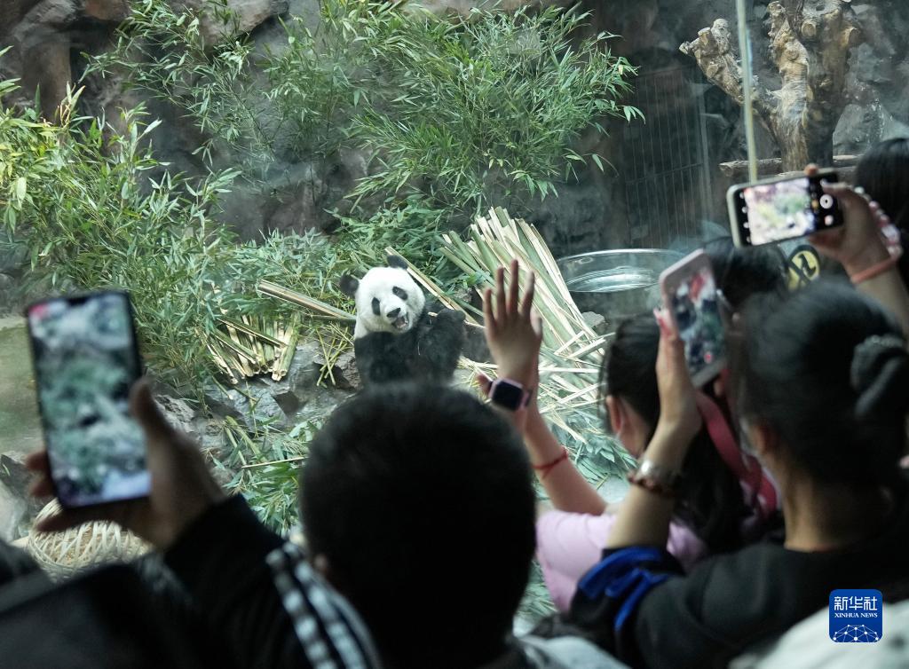 4月30日,游客在北京動物園大熊貓館觀賞大熊貓。