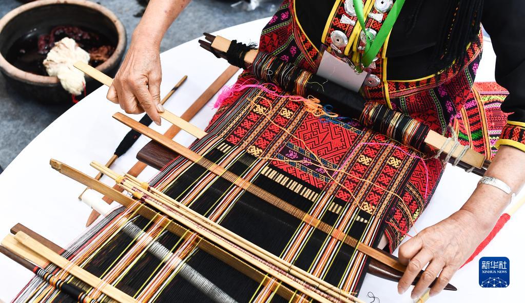 4月30日,在2023海南錦繡世界文化周非物質文化遺產傳統織繡印染技藝項目精品展上,手工藝人正在編織黎錦。