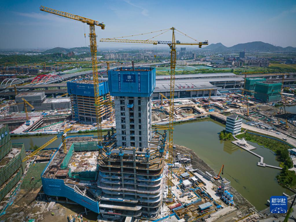 4月30日在浙江紹興拍攝的中建三局紹興北站TOD綜合交通樞紐工程建設(shè)現(xiàn)場(chǎng)(無(wú)人機(jī)照片)。