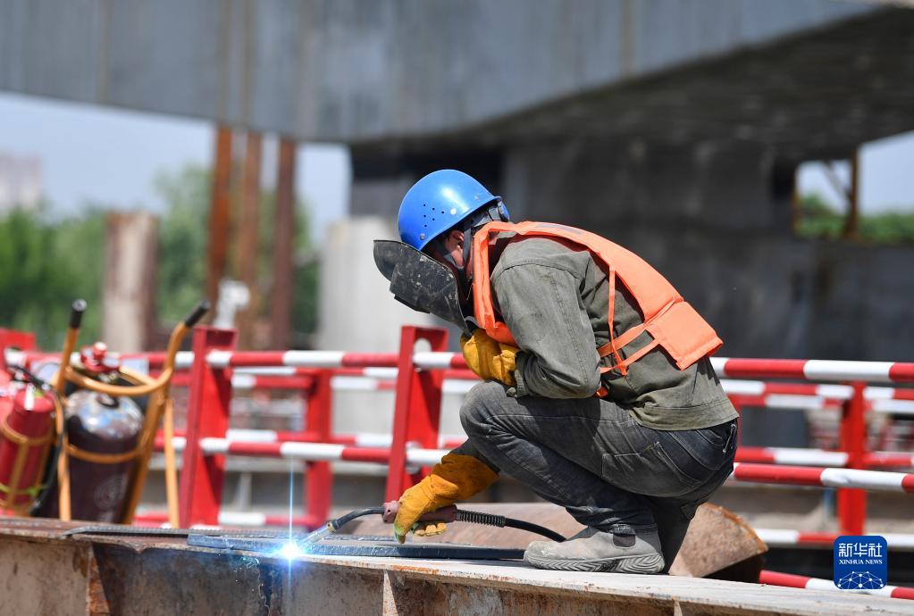 4月30日,在位于陜西省西安市國際港務區的水流路跨灞河大橋項目施工現場,一名電焊工在進行焊接作業。