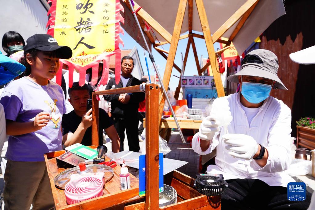 4月30日,在山東省利津縣“老街長巷”非遺文化街,游客觀看吹糖人制作。