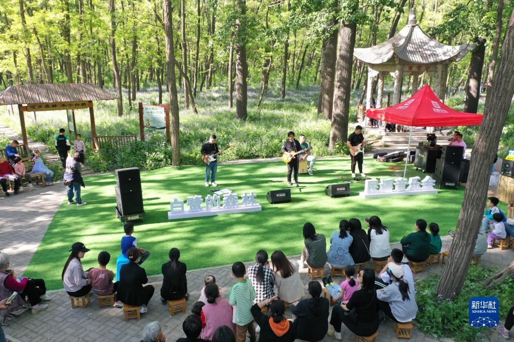 4月30日,游客在山東省濱州市惠民縣石廟鎮沙窩林場千畝槐樹林欣賞民謠音樂會。