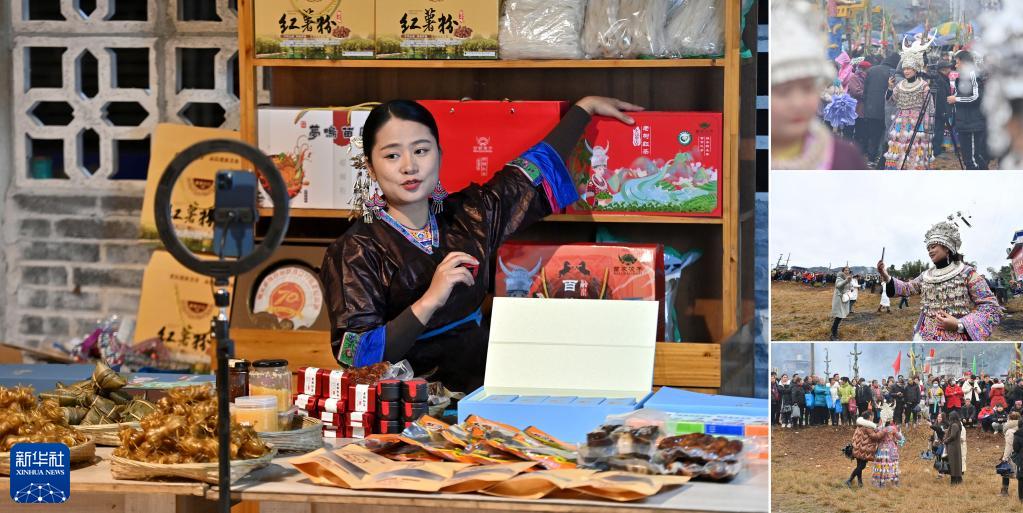 拼版照片:左圖為“90后”苗族姑娘賈宥凌在廣西融水苗族自治縣夢嗚苗寨的工作室直播帶貨(2023年4月24日攝);右上、中、下圖為賈宥凌在坡會(huì)上做直播(2023年2月6日攝)。