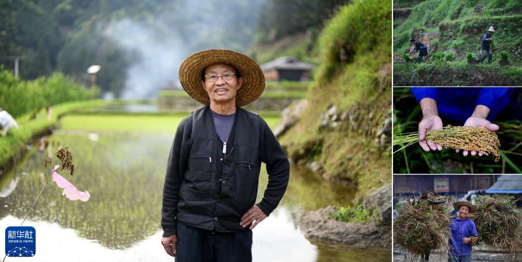 拼版照片:左圖為廣西融水苗族自治縣桿洞鄉(xiāng)烏英苗寨73歲的老人梁安合(2023年4月25日攝);右上圖為梁安合(右)和老伴在田間插秧(2020年5月21日攝);右中圖為梁安合展示收獲的稻谷(2020年9月10日攝);右下圖為梁安合勞作歸來(lái)(2019年3月25日攝)。