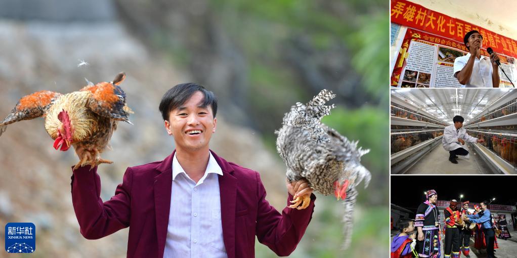 拼版照片:左圖為在廣西大化瑤族自治縣七百弄鄉弄雄村,藍志平展示七百弄雞(2019年11月10日攝);右上圖為在弄雄村七百弄雞養殖產業發展動員會上,藍志平動員群眾發展土雞養殖(2016年8月17日攝);右中圖為在弄雄村七百弄雞養殖場,藍志平在查看種雞的生長情況(2019年11月10日攝);右下圖為在大化瑤族自治縣大化鎮仁良村,藍志平(右)捐贈七百弄雞(2023年4月15日攝)。