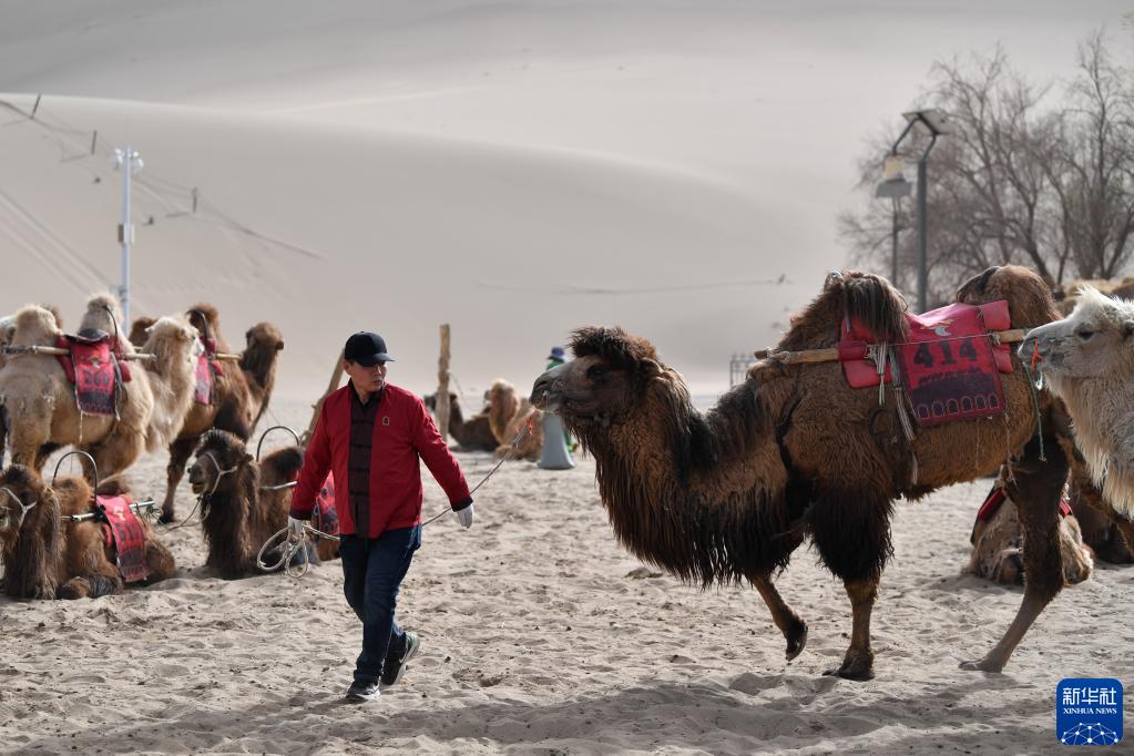 曹文華牽著駱駝在鳴沙山月牙泉景區駱駝騎乘點等待游客(4月24日攝)。