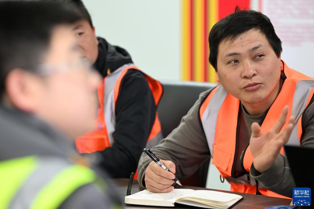 齊國超(右)在項目部參會討論下一階段施工任務(4月26日攝)。