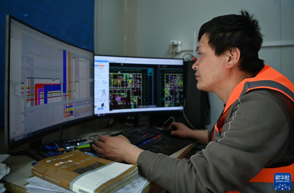 齊國超使用電腦修改施工圖(4月26日攝)。