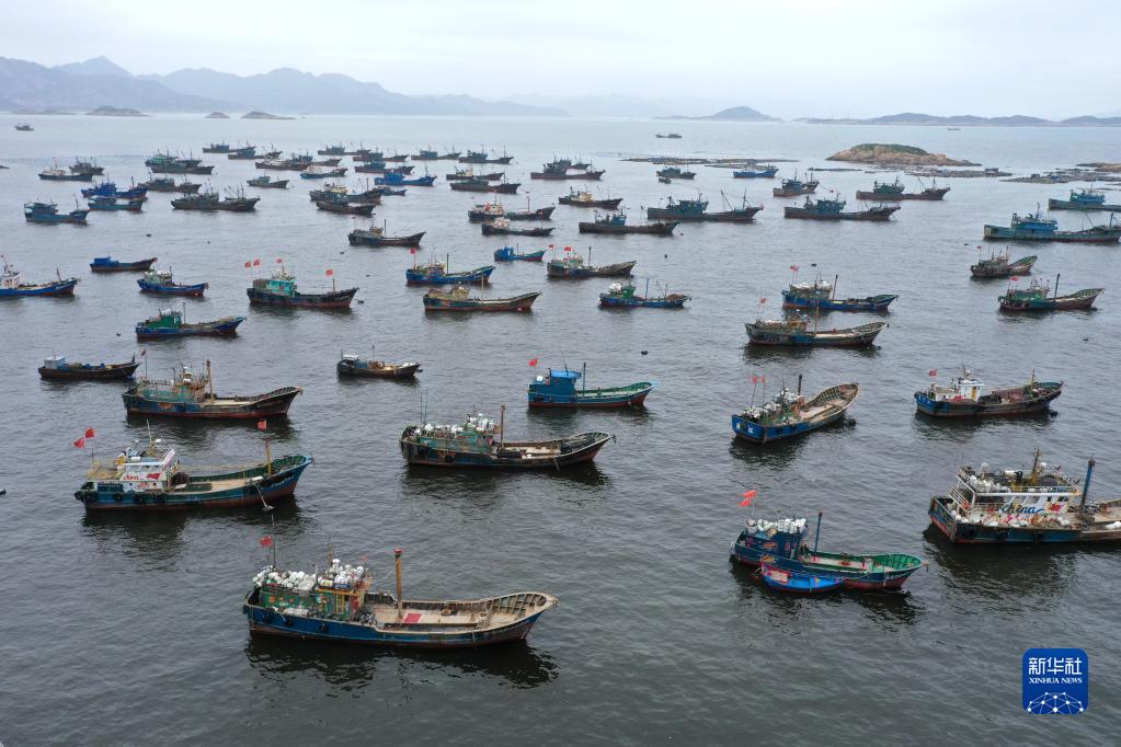 4月30日,準備休漁的漁船停泊在福建省福州市連江縣苔菉鎮北茭村漁港(無人機照片)。
