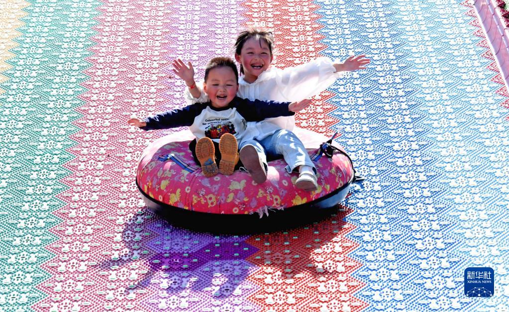 5月1日,小朋友在浙江省臺州市仙居縣一游樂園體驗(yàn)七彩滑道。