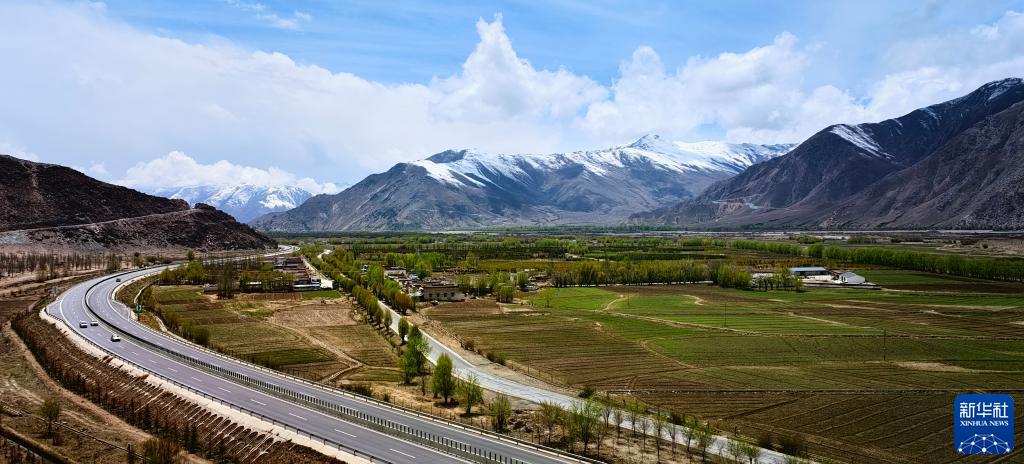 拉薩市達孜區塔杰鄉的田野,拉薩至林芝高速公路穿行其中(手機照片,4月30日攝)。