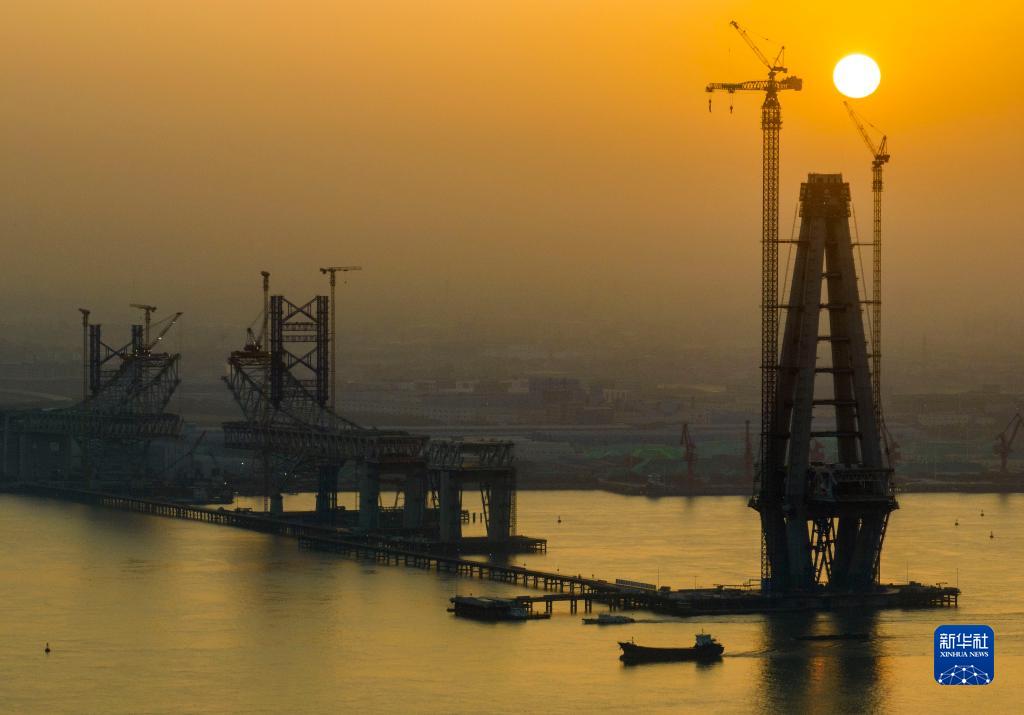 5月1日,中交二航局工人在江蘇常泰長(zhǎng)江大橋5號(hào)墩主塔作業(yè)(無(wú)人機(jī)照片)。