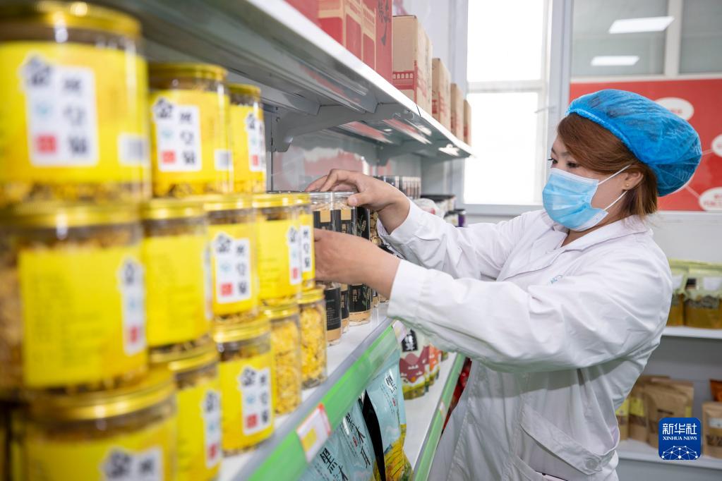 5月1日,在寧夏銀川市永寧縣閩寧鎮禾美電商車間,工作人員在整理商品。