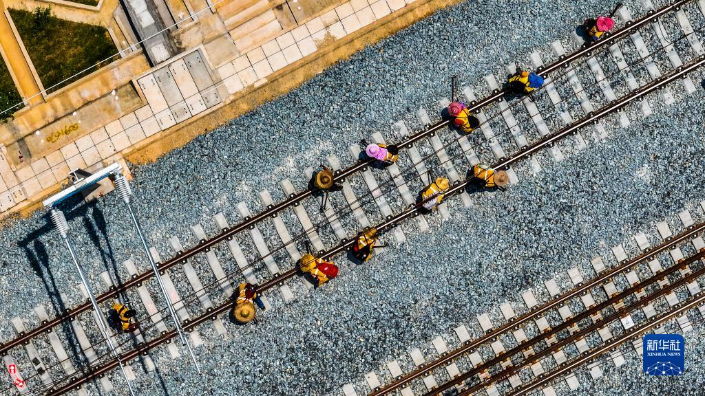 5月1日,中國鐵路南寧局集團有限公司南寧工務(wù)段貴南高鐵軌道精調(diào)組的工人在貴南高鐵南寧樞紐有砟路段整理道床(無人機照片)。