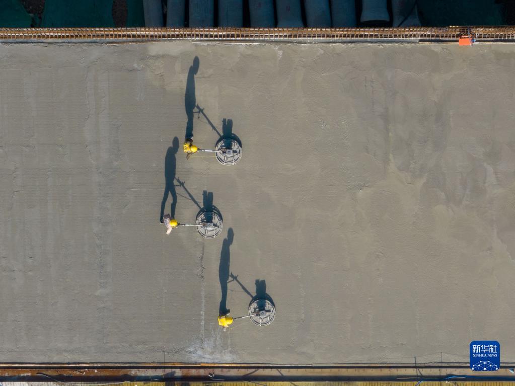 5月1日,工人在安徽省合肥市肥東縣橋頭集路快速化改造建設工地施工(無人機照片)。