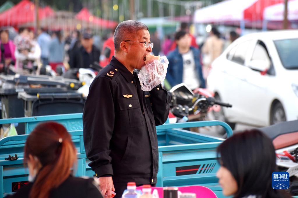 4月30日,在淄博市沂源縣悅莊鎮下龍巷村燒烤廣場,鎮市場監督管理所的一名工作人員在值勤現場吃晚餐。