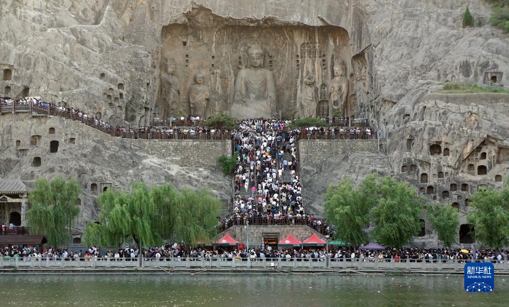 4月30日,游客在河南洛陽龍門石窟景區游覽。