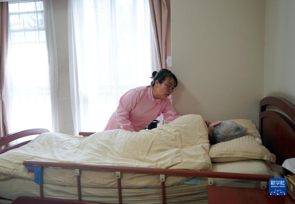 4月28日,在上海市楊浦區社會福利院,護理主管張智萍在照料臥床的老年人。