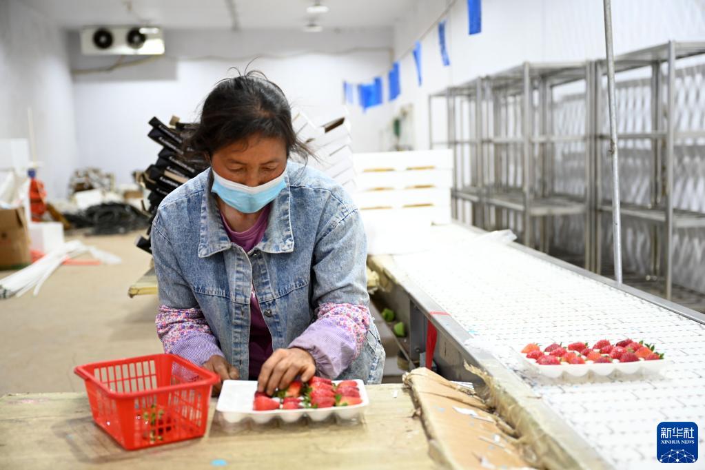 5月1日,工作人員在隆化縣七家鎮(zhèn)西道村的草莓基地包裝草莓。
