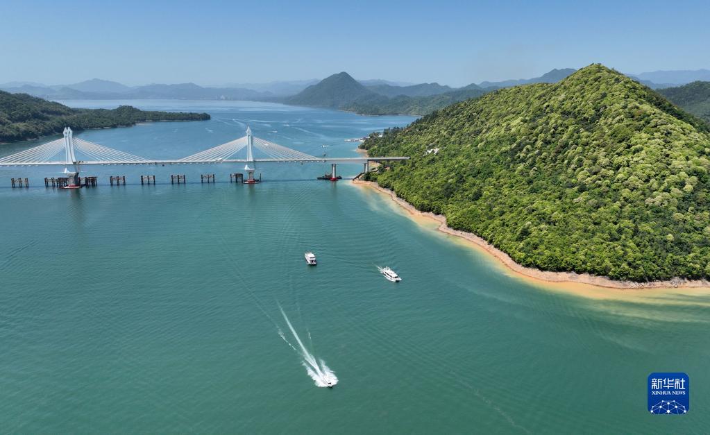 5月1日,游客在安徽省黃山市太平湖上乘船游玩(無人機照片)。