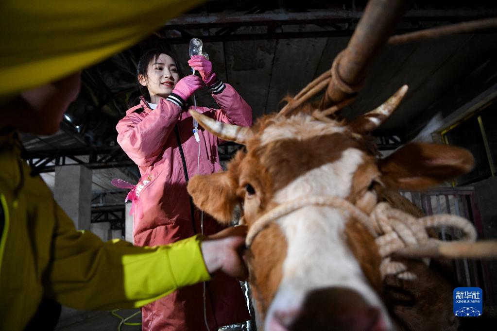 晚上10點多,白婳在固原市原州區開城鎮和泉村為一頭牛輸液(4月17日攝)。