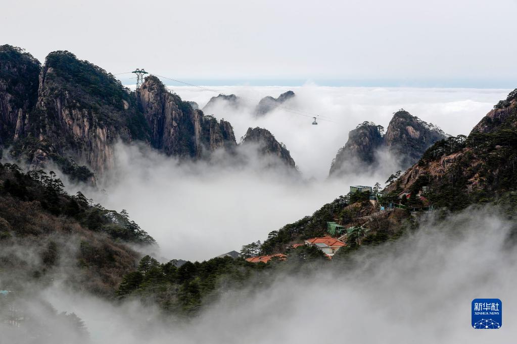 2021年3月10日拍攝的云霧中的黃山北海一帶美景。