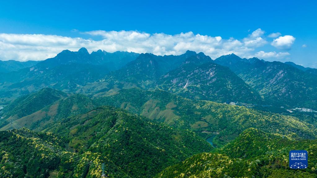 2023年4月26日,雨過天晴,白云橫臥黃山峰頂(無人機照片)。