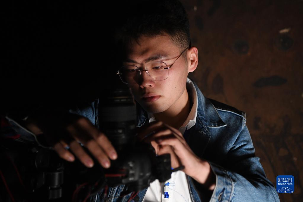 敦煌研究院文物數字化保護團隊圖像采集人員熊業騰在洞窟內調試設備,準備進行壁畫圖像采集(4月25日攝)。