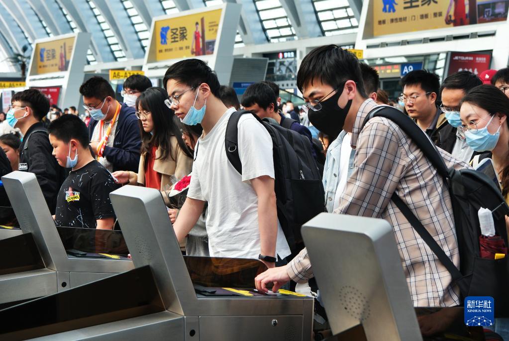 5月3日,旅客在天津西站通過檢票口準備乘車。