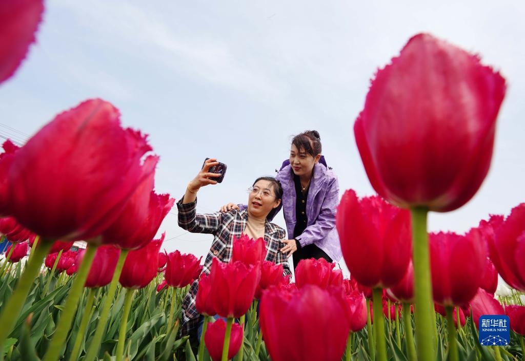 5月3日,游客在河北省灤南縣東黃坨鎮(zhèn)閆莊戶村郁金香種植基地拍照。