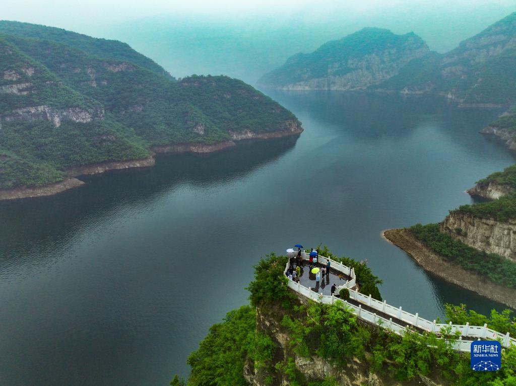 5月3日,游客在河南省濟源市黃河三峽景區(qū)游覽孤山峽景色(無人機照片)。