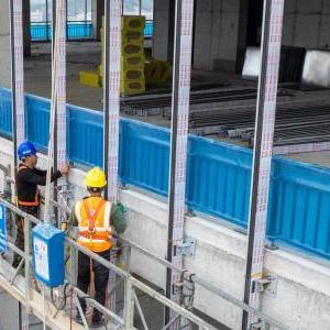 5月3日,工人在湖南長沙智谷項目建設工地為一棟高層建筑安裝幕墻(無人機照片)。