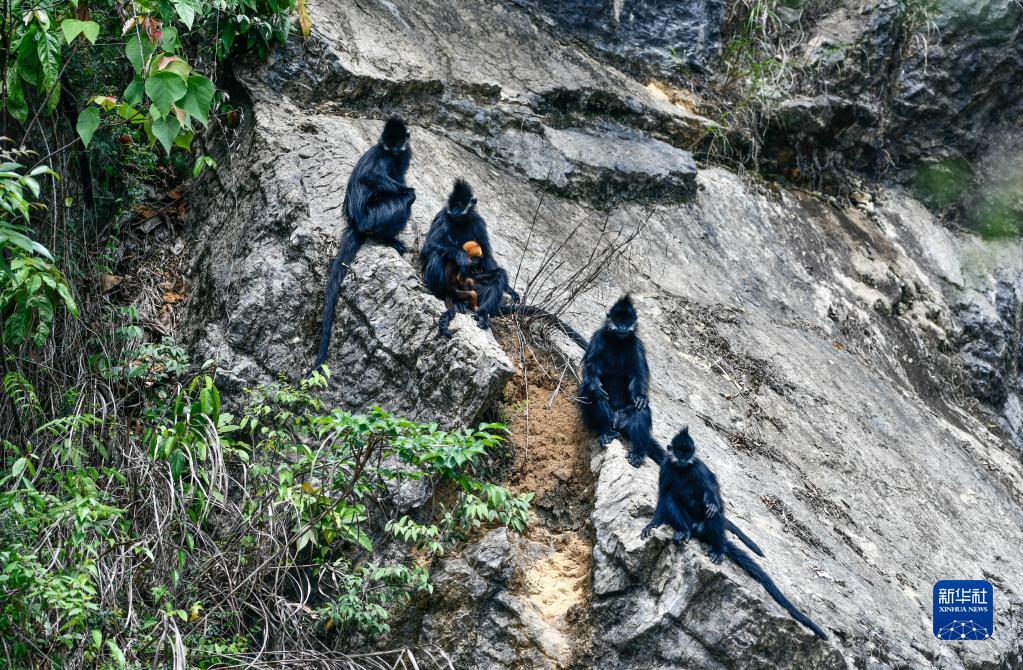 5月1日拍攝的貴州麻陽(yáng)河國(guó)家級(jí)自然保護(hù)區(qū)的黑葉猴及幼猴。
