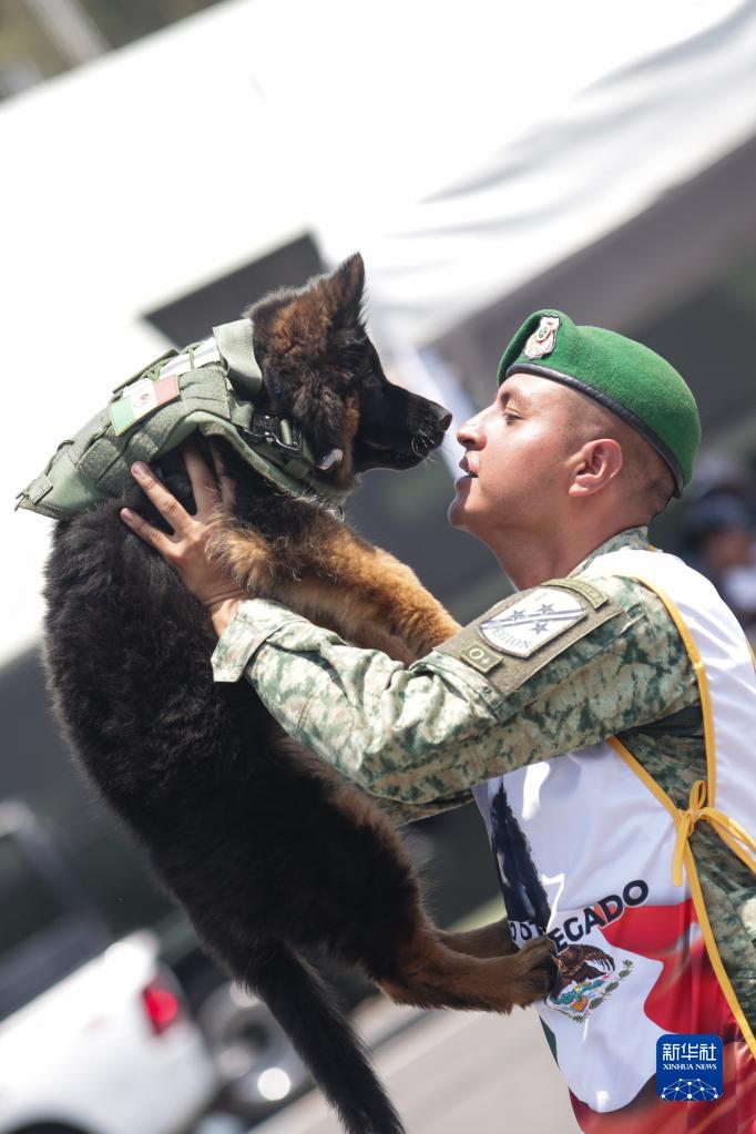 5月3日,在墨西哥瑙卡爾潘一處軍事基地,訓導員抱著土耳其贈送的小狗。
