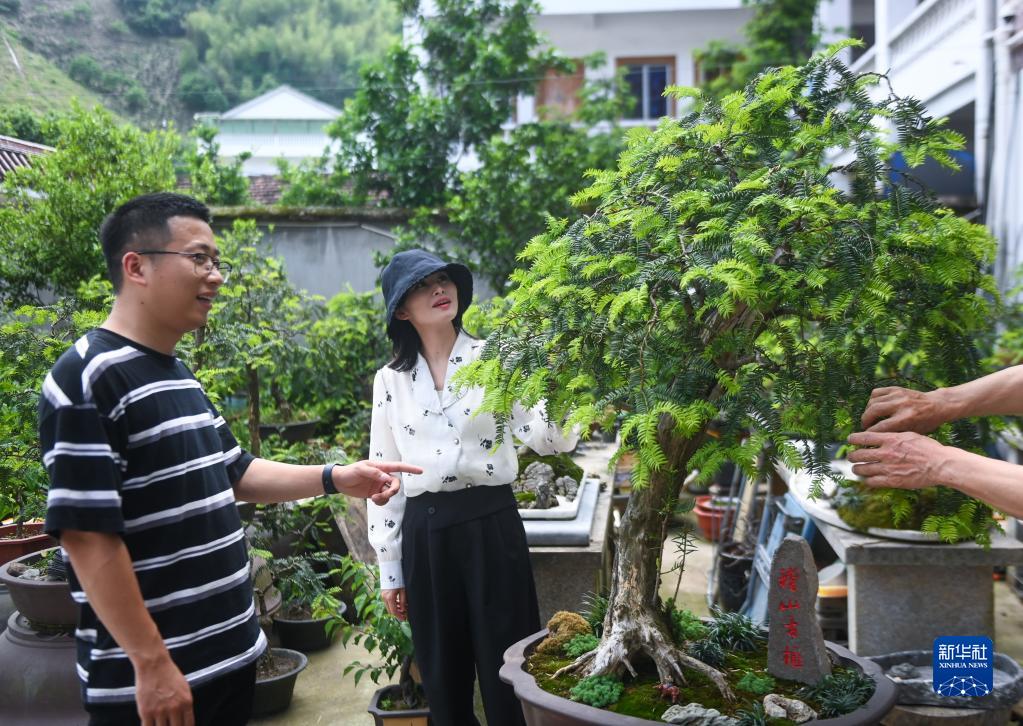 5月4日,90后青創客金志鵬(左)在香榧盆景園中給游客介紹不同造型的香榧盆景。