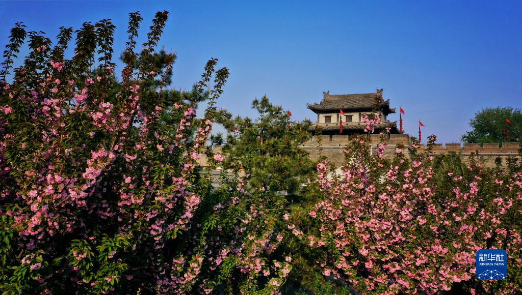 西安城墻掩映在繁花之中(4月1日攝,無人機照片)。