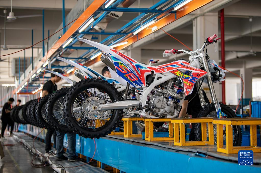 5月4日,在浙江省金華市武義縣桐琴鎮五金工業區的一家企業,工人趕制準備銷往海外的越野摩托車。