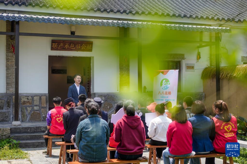 5月4日,在浙江省湖州市長(zhǎng)興縣和平鎮(zhèn)狄家?村,當(dāng)?shù)厍嗄旮刹繃惶霉采锑l(xiāng)村改革,暢談家鄉(xiāng)發(fā)展。