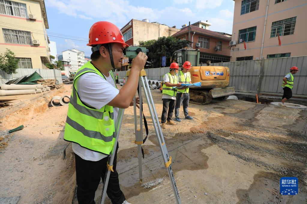 5月4日,青年工人在貴州省銅仁市江口縣雙江街道雙月社區城市供排水提升工程施工現場工作。