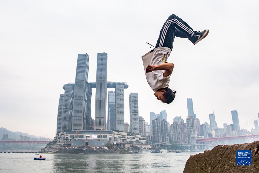 2023年4月21日,重慶躍飛跑酷隊(duì)員文舜堯在重慶朝天門對(duì)岸的江灘上展示跑酷動(dòng)作。