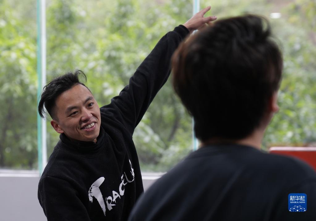 2023年2月23日,文舜堯在重慶躍飛跑酷俱樂部內與同事一起討論教學內容。