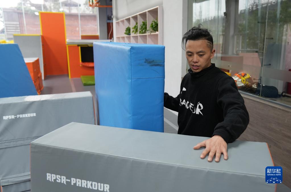 2023年2月23日,文舜堯在重慶躍飛跑酷俱樂部內(nèi)擺放訓(xùn)練器材。