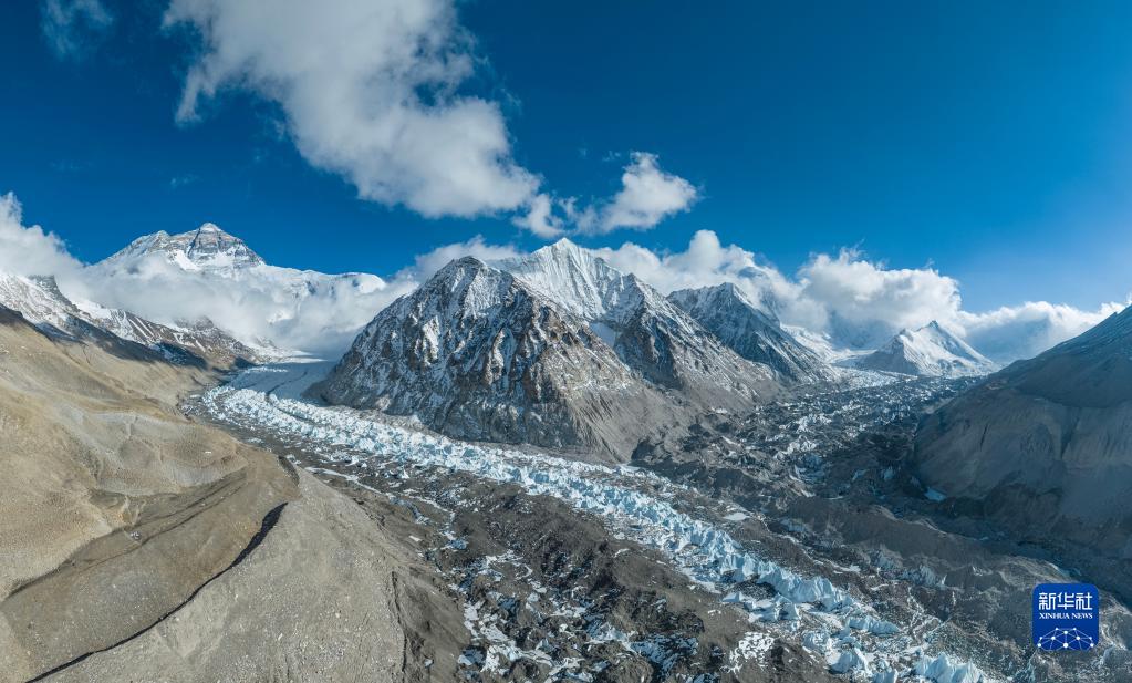 這是珠峰腳下中絨布冰川(左)和西絨布冰川(右)的匯合處(5月16日攝,無人機(jī)拼接照片)。
