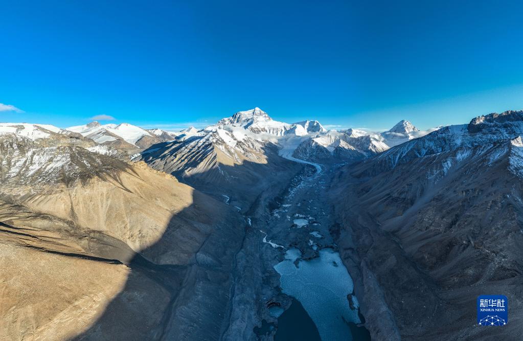這是日落時分的珠峰和絨布冰川(5月16日攝,無人機(jī)照片)。